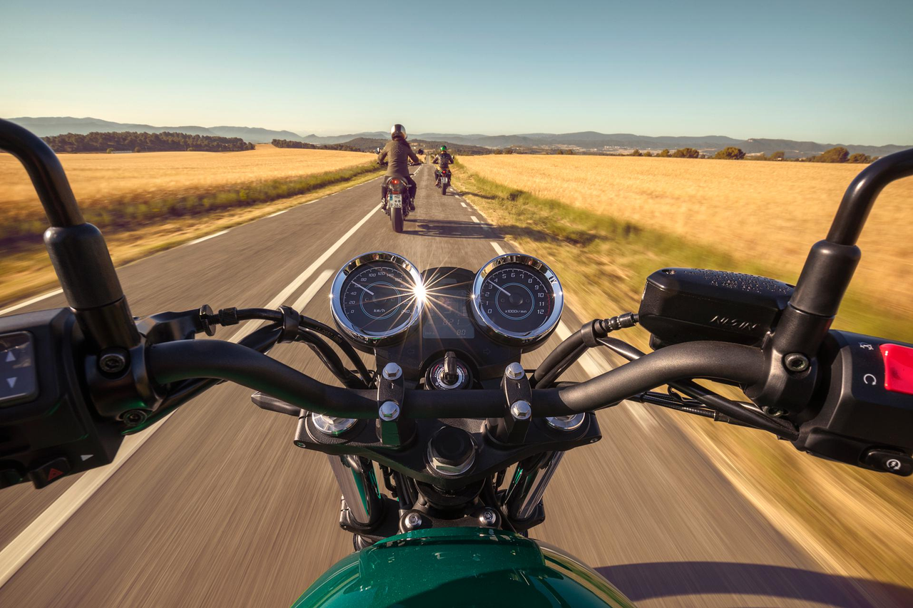 Dual Ø 300 mm front disc brakes and Ø 220 mm rear deliver plenty of braking power. The round discs contribute to the bike’s retro sport image.