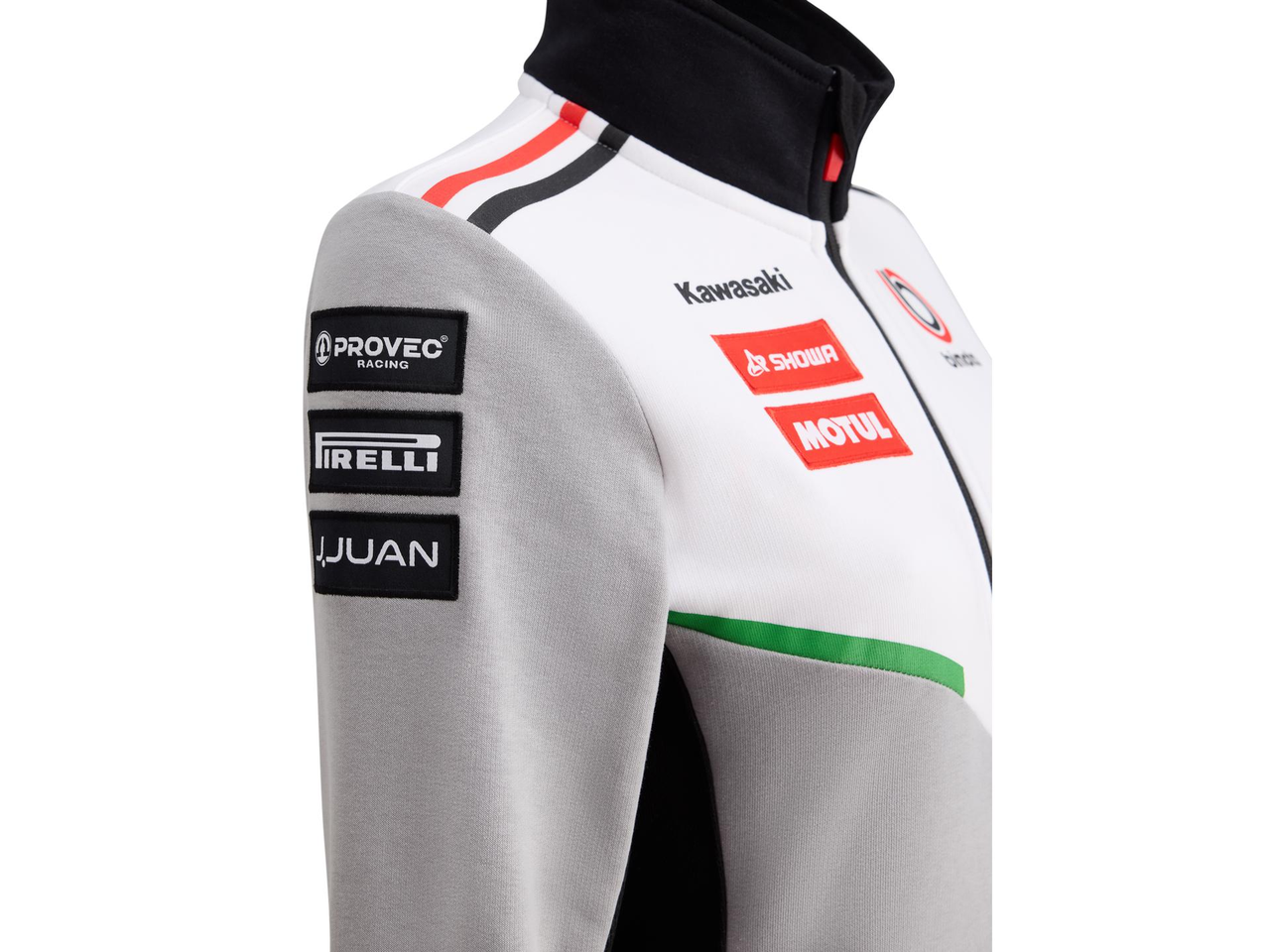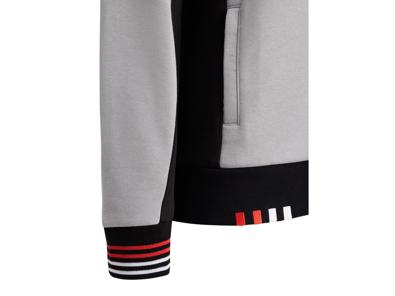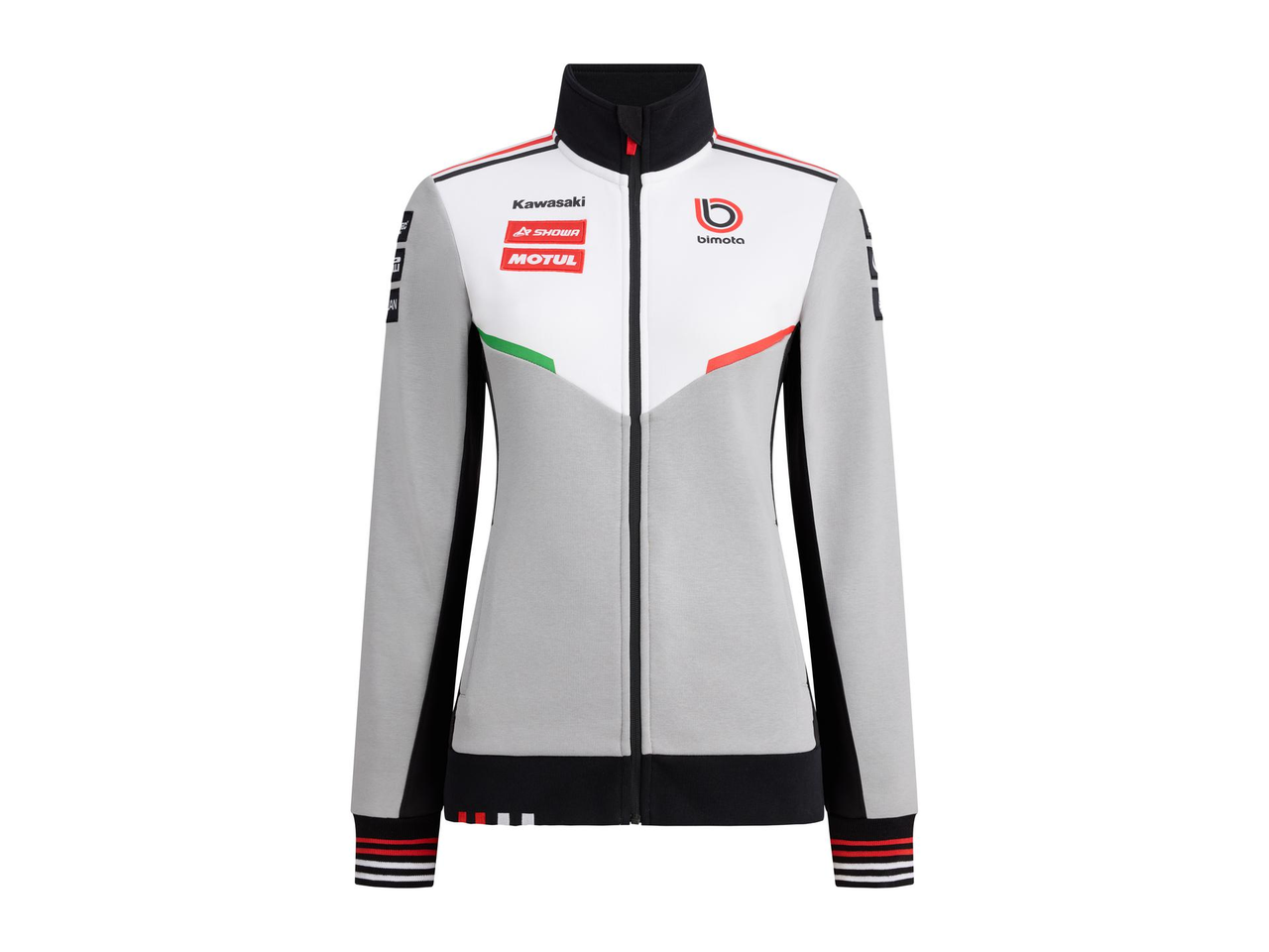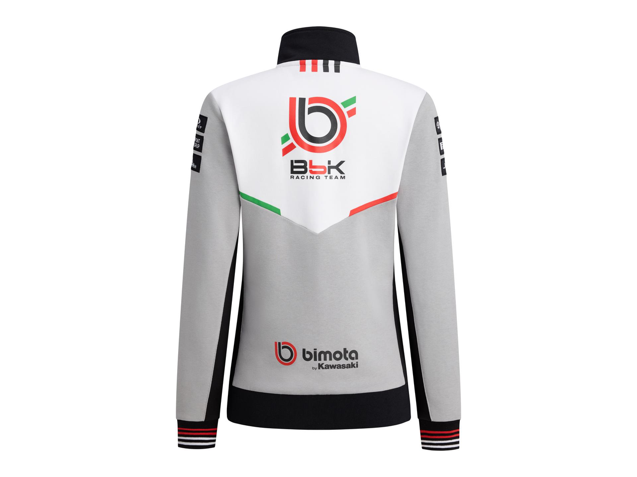 Bimota/BbKRT-genser i grått, hvitt og svart, med glidelås, stående krage og praktiske glidelåslommer. Mansjettene har røde og hvite detaljer, og nedre kant er ribbestrikket med brodert Bimota-logo i rødt og hvitt.