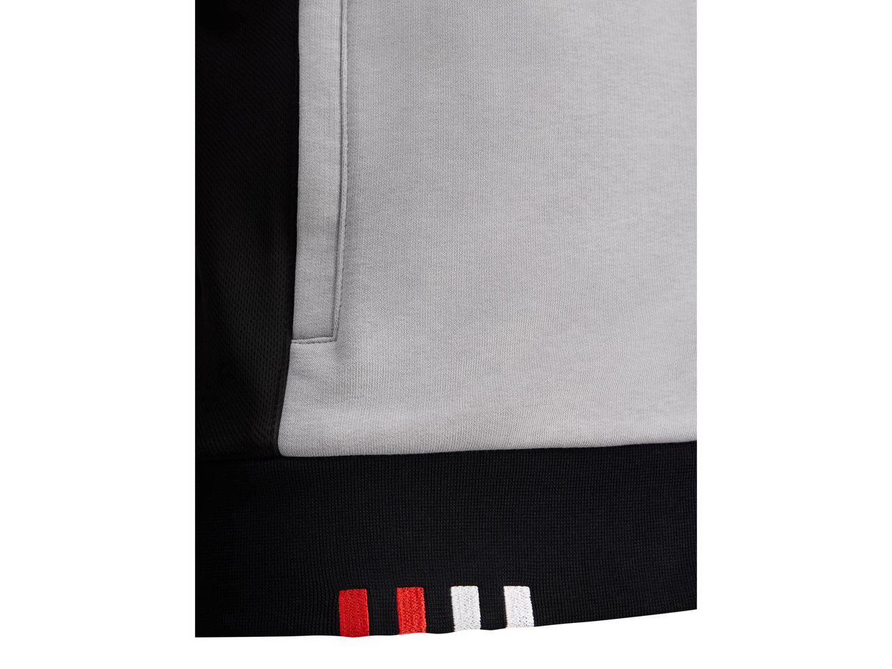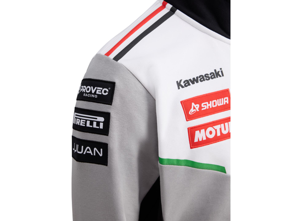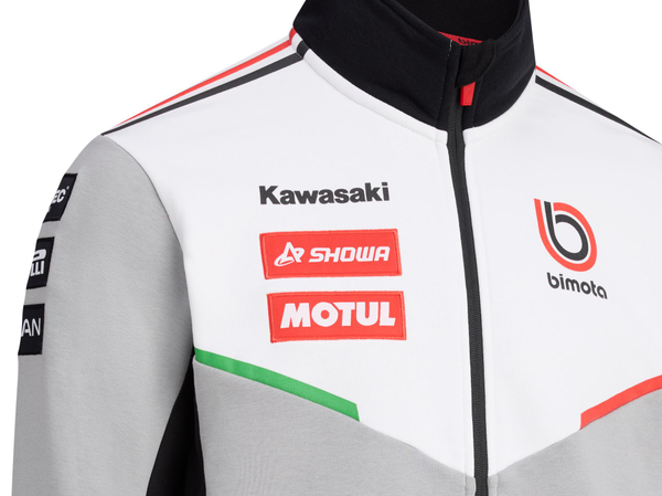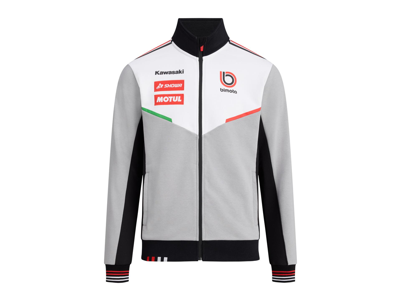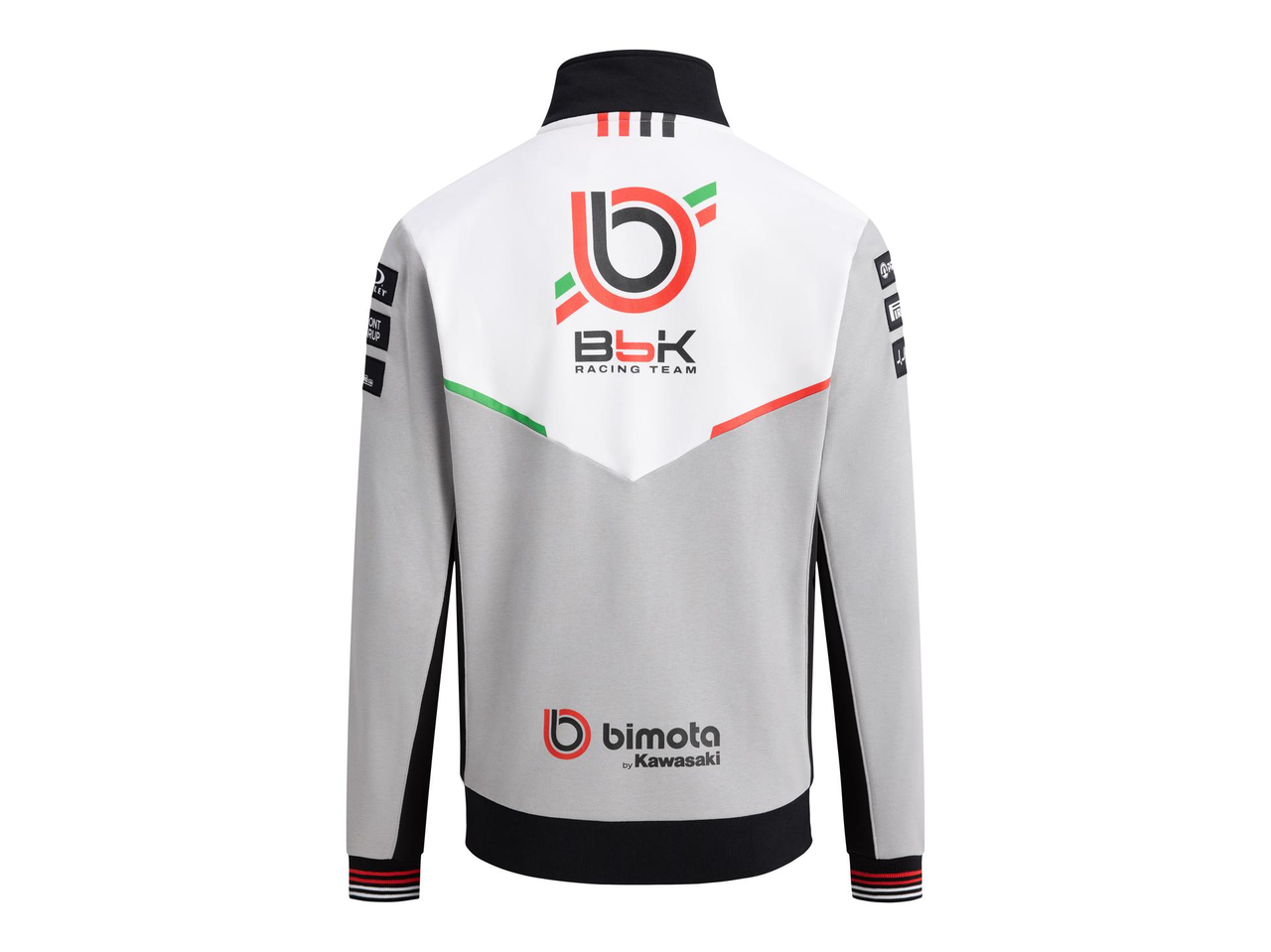 Bimota/BbKRT-genser i grått, hvitt og svart, med glidelås, stående krage og praktiske glidelåslommer. Mansjettene har røde og hvite detaljer, og nedre kant er ribbestrikket med brodert Bimota-logo i rødt og hvitt.