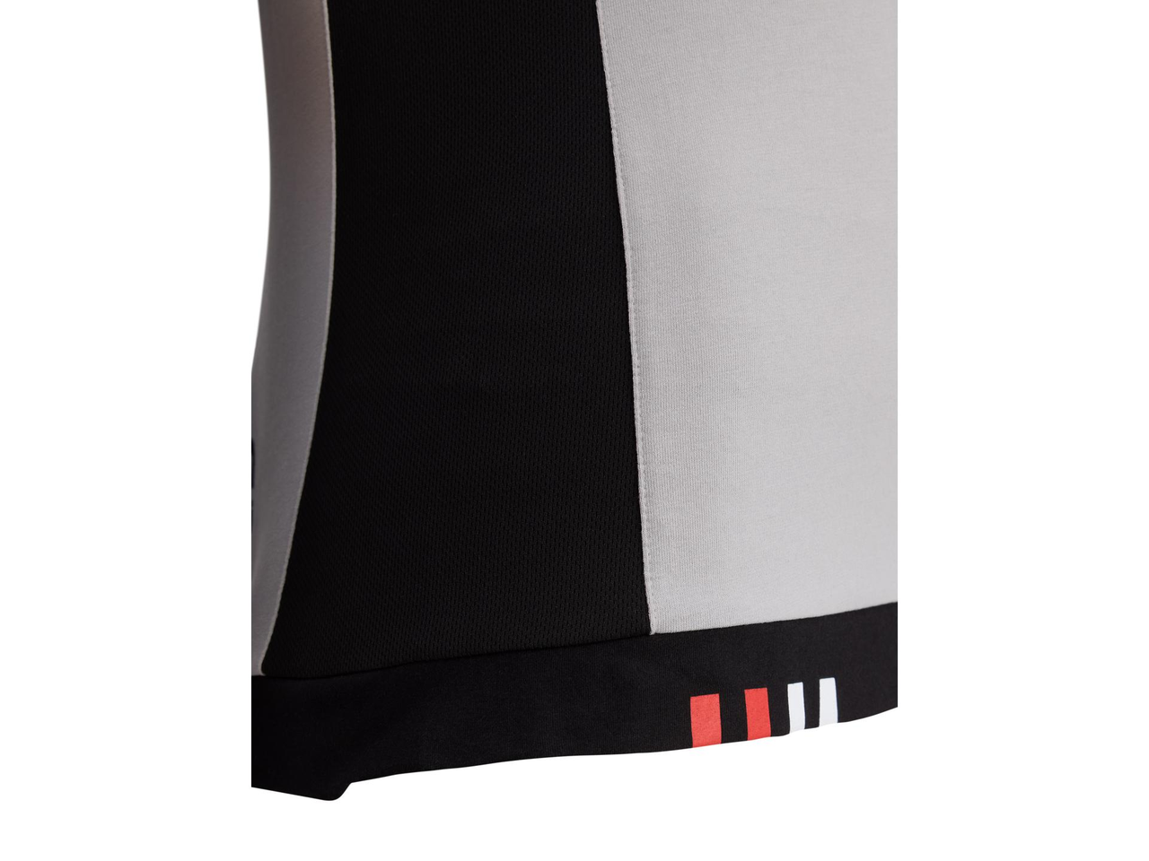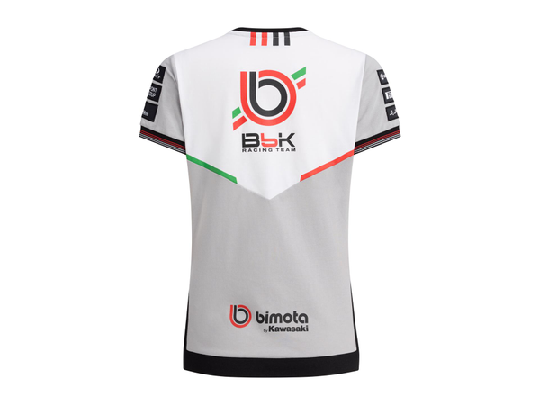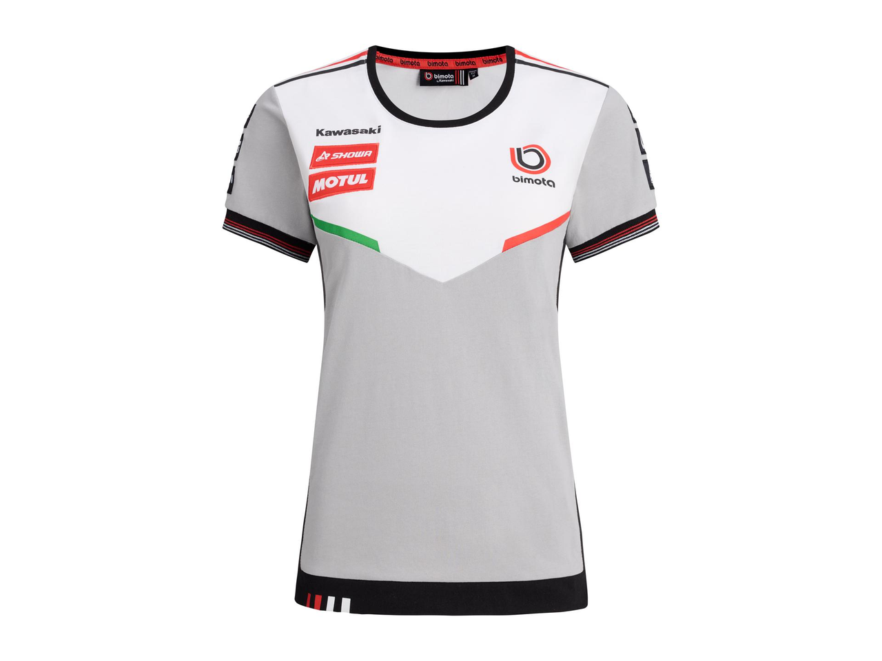 Kortermet t-skjorte med rund hals. Ermekantene har ribb i rødt og hvitt, og nederkanten har de karakteristiske røde og hvite Bimota-detaljene.