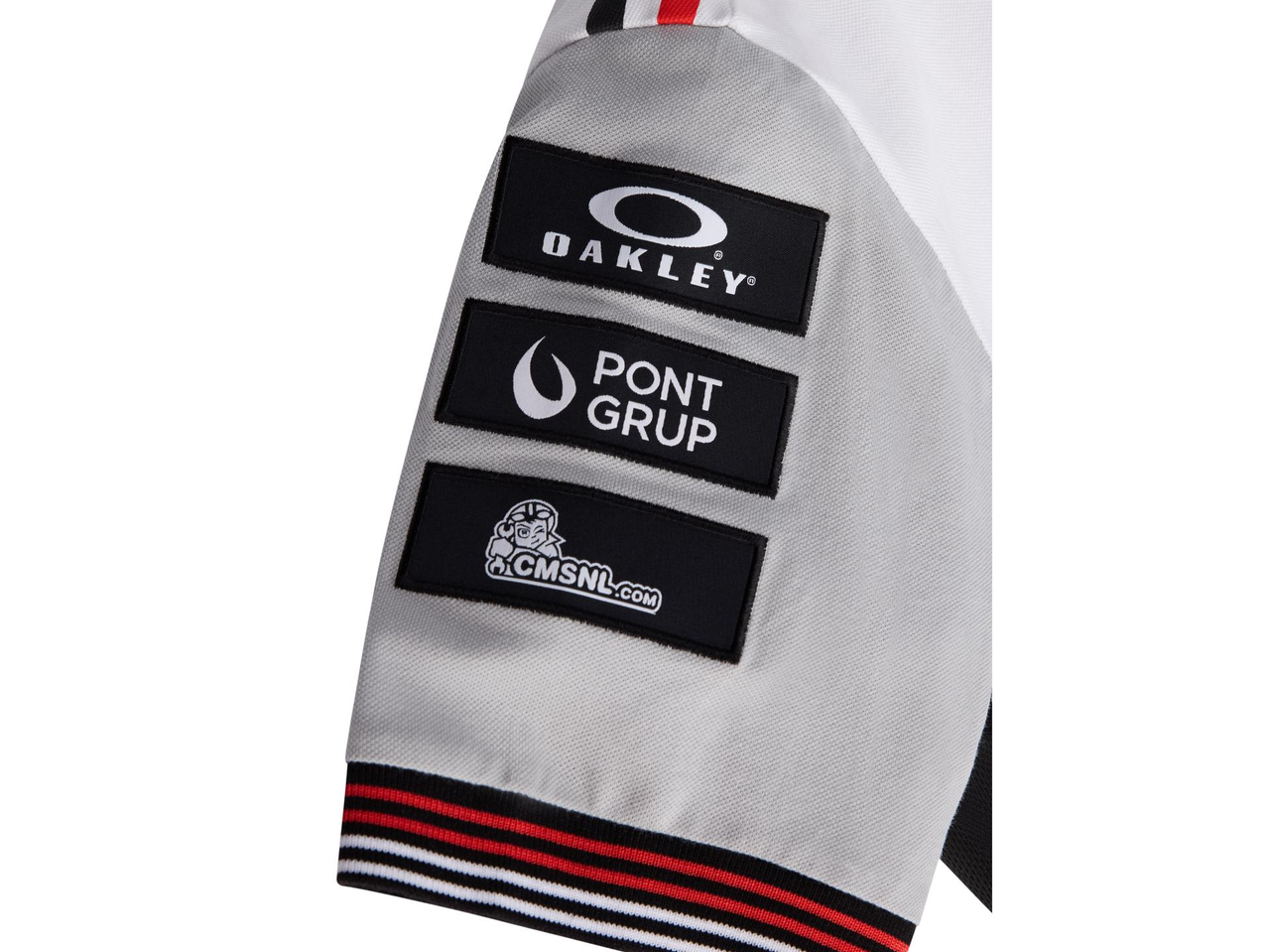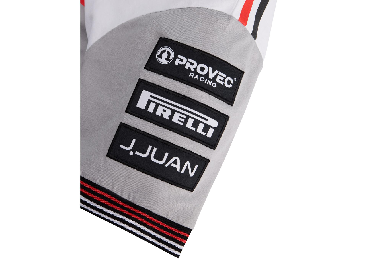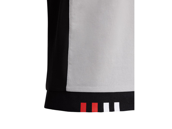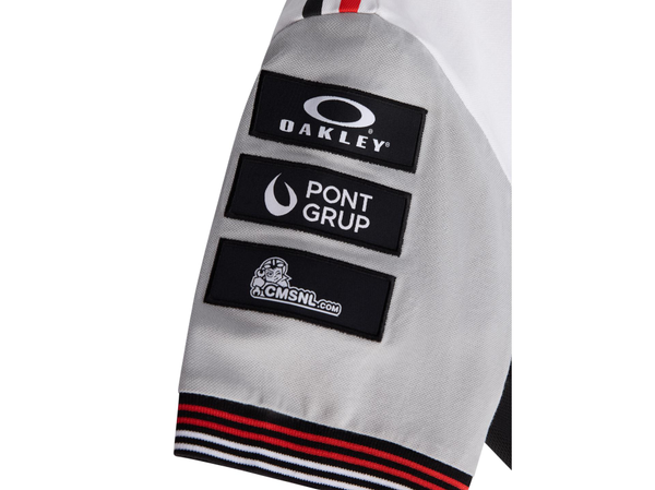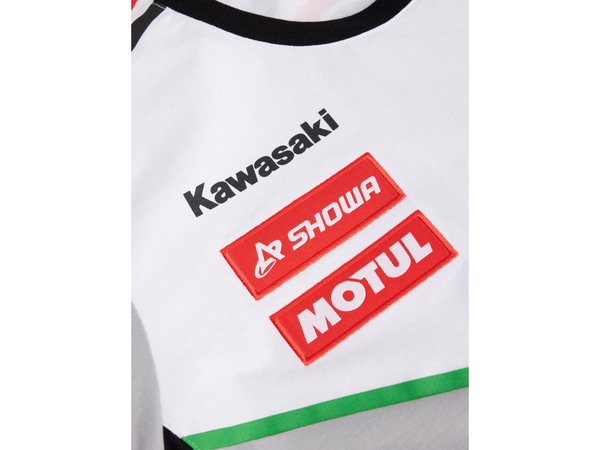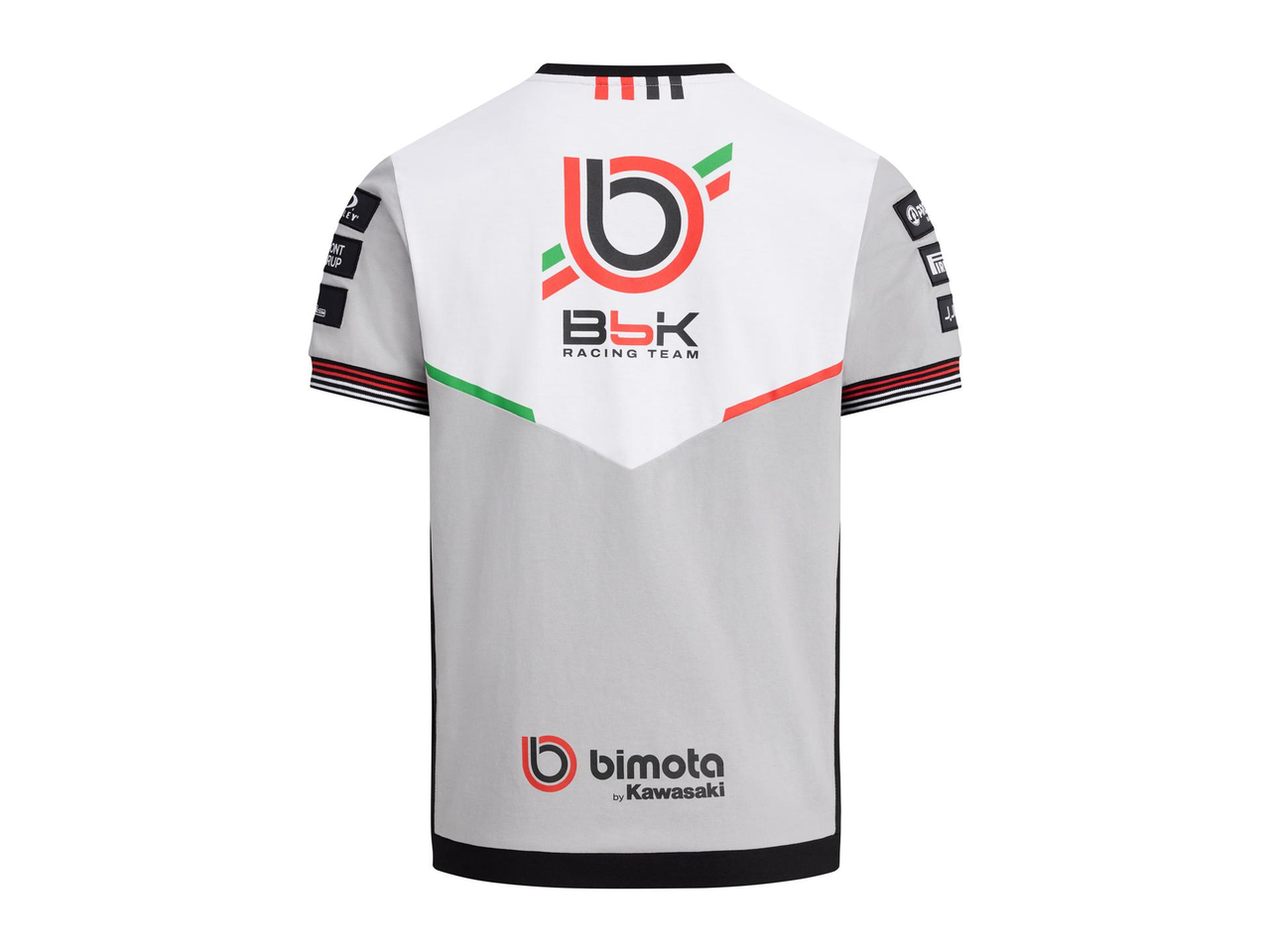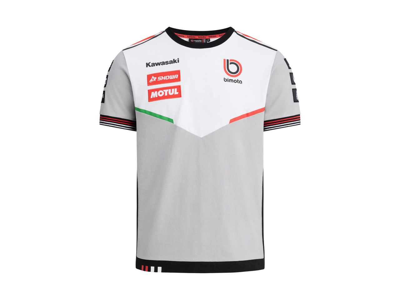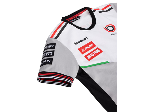 Kortermet t-skjorte med rund hals. Ermekantene har ribb i rødt og hvitt, og nederkanten har de karakteristiske røde og hvite Bimota-detaljene.