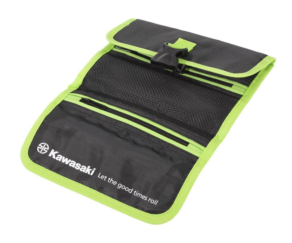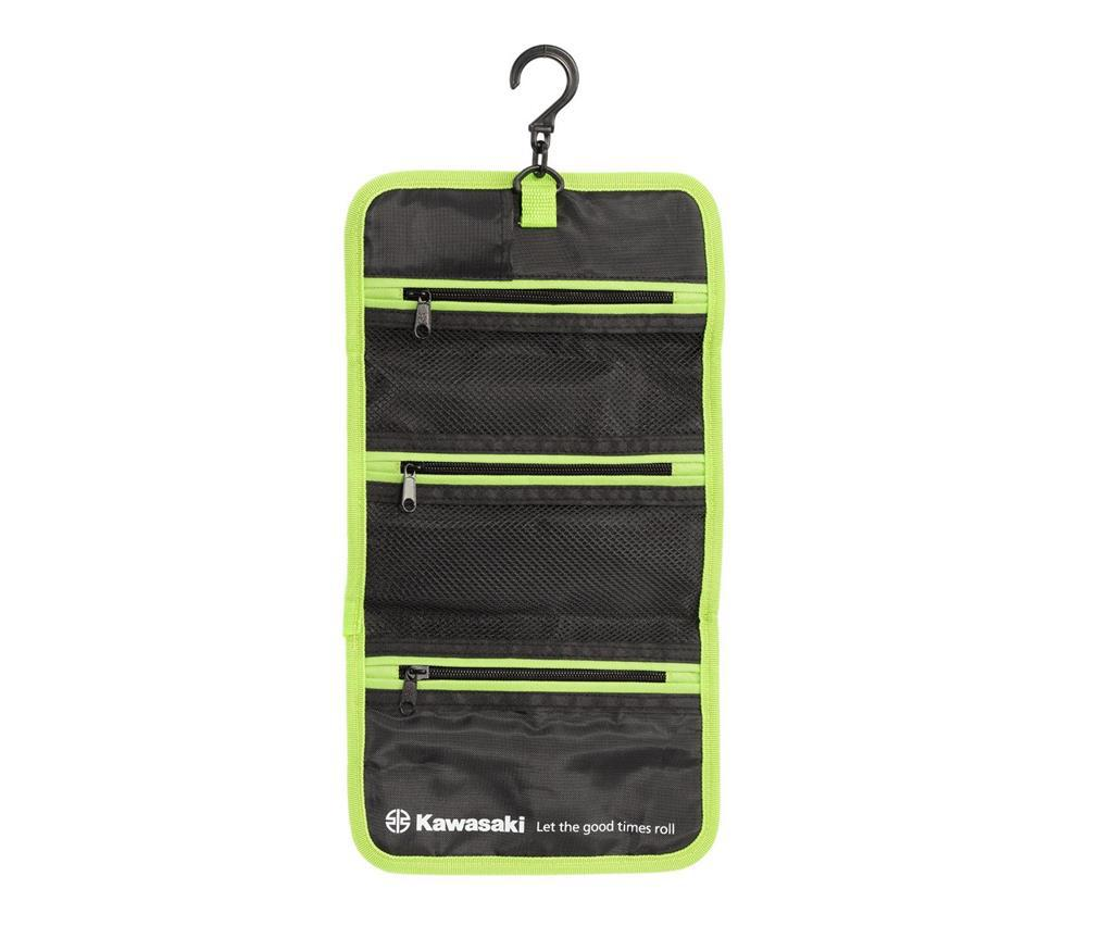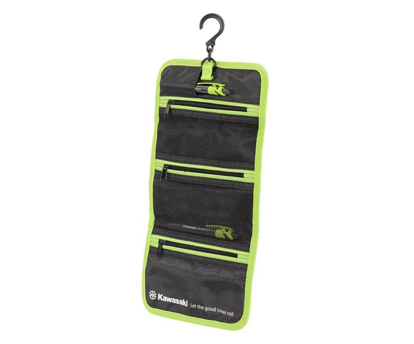 Rullbar toalettveske med krok og tre glidelåslommer. Åpen størrelse: 21 cm bred x 40 cm lang.