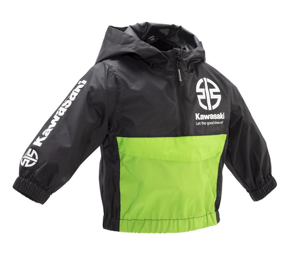 Vannavstøtende regnjakke som holder vår lille Kawasaki‑baby tørr.